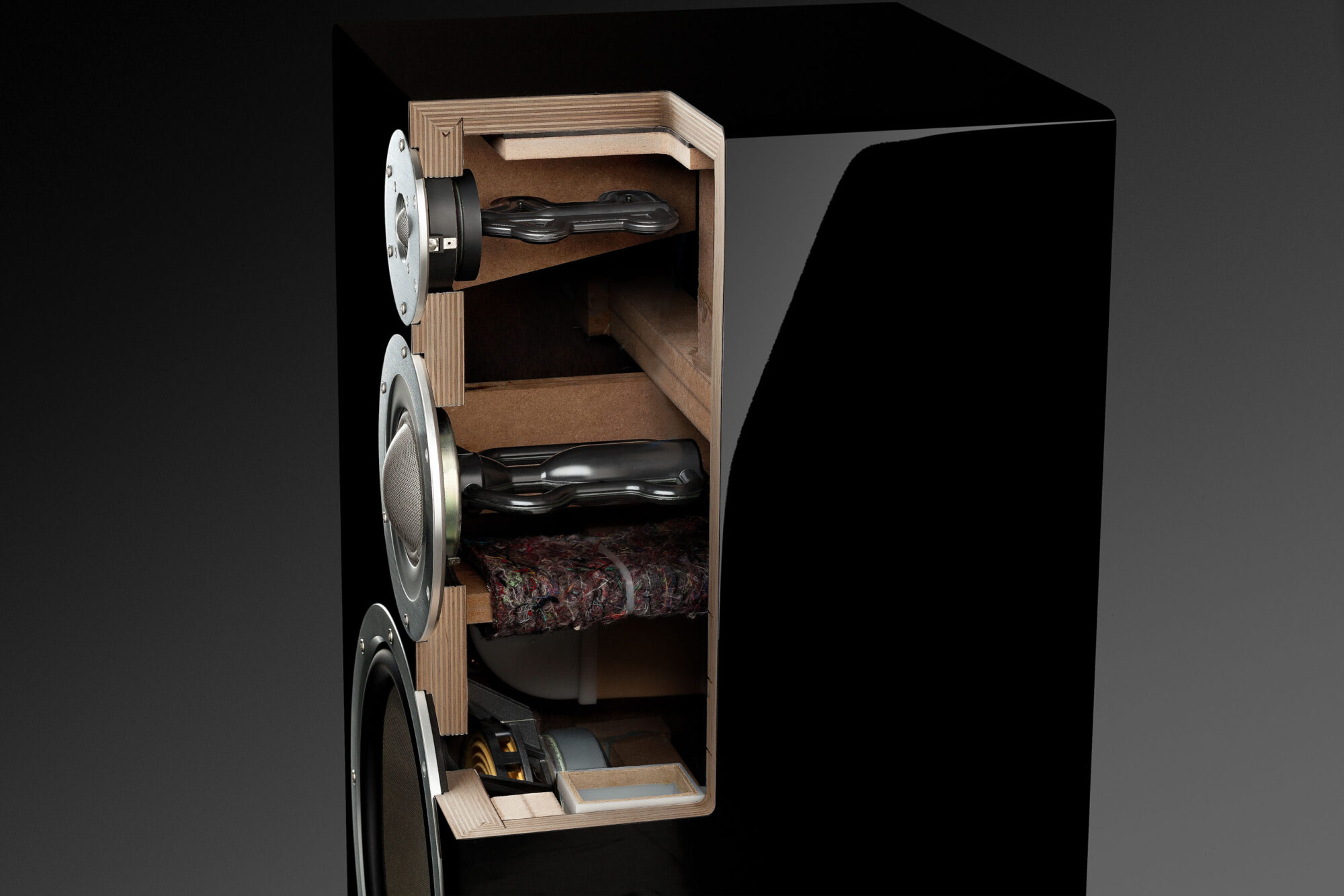 Les chambres R.S. (Resonance Suppression), montées derrière le tweeter et le médium, éliminent les résonances internes, assurant une clarté exceptionnelle dans les médiums et aigus. L’absorbeur acoustique innovant supprime les ondes stationnaires sans recourir à des matériaux absorbants traditionnels, préservant ainsi la dynamique et la richesse harmonique de la musique.